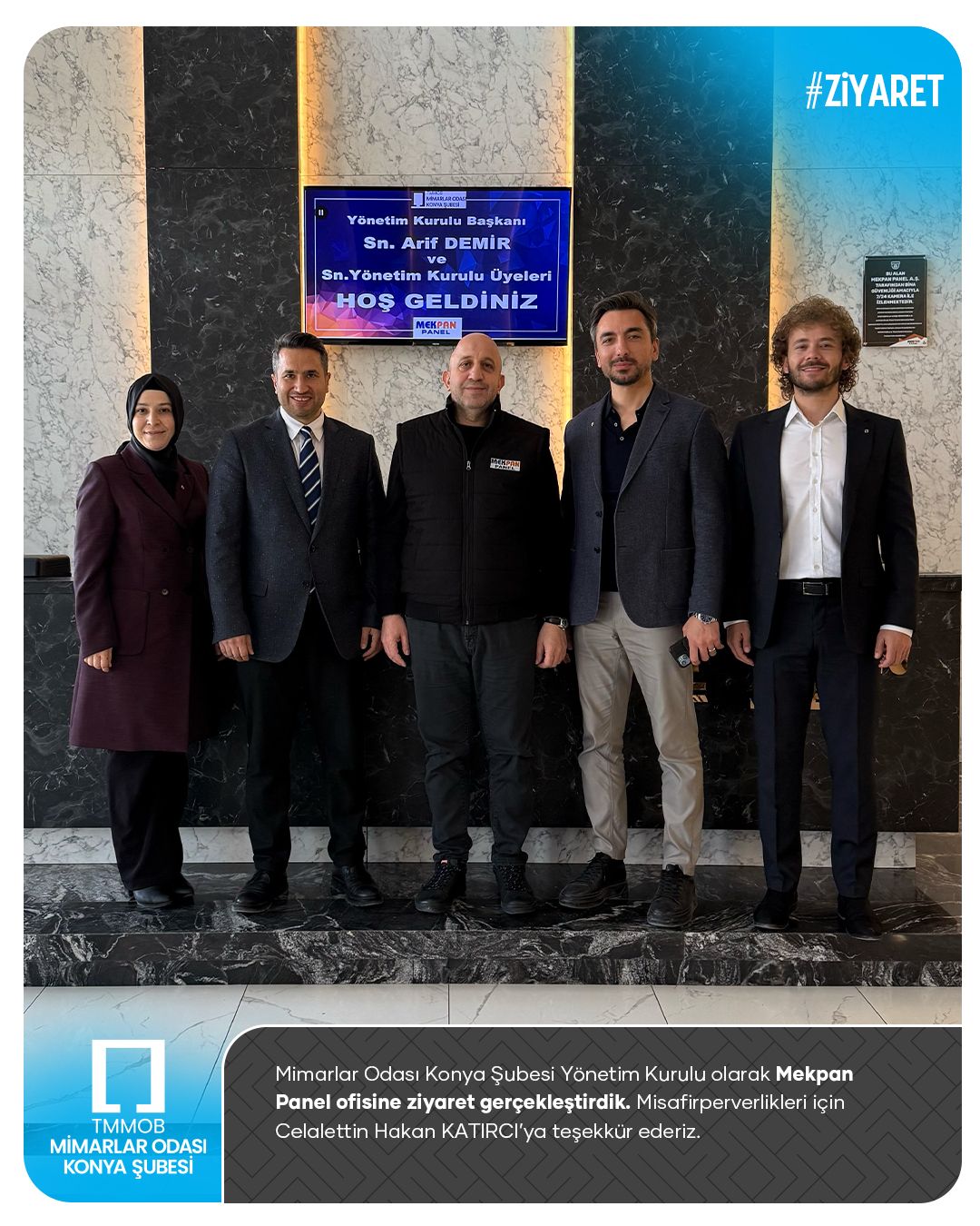 Mimarlar Odası Konya Şubesi Yönetim Kurulu olarak Mekpan Panel ofisine ziyaret gerçekleştirdik. Misafirperverlikleri için Celalettin Hakan KATIRCI’ya teşekkür ederiz.