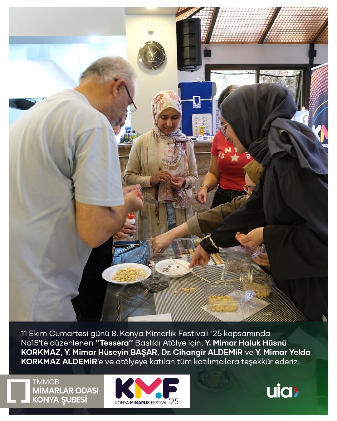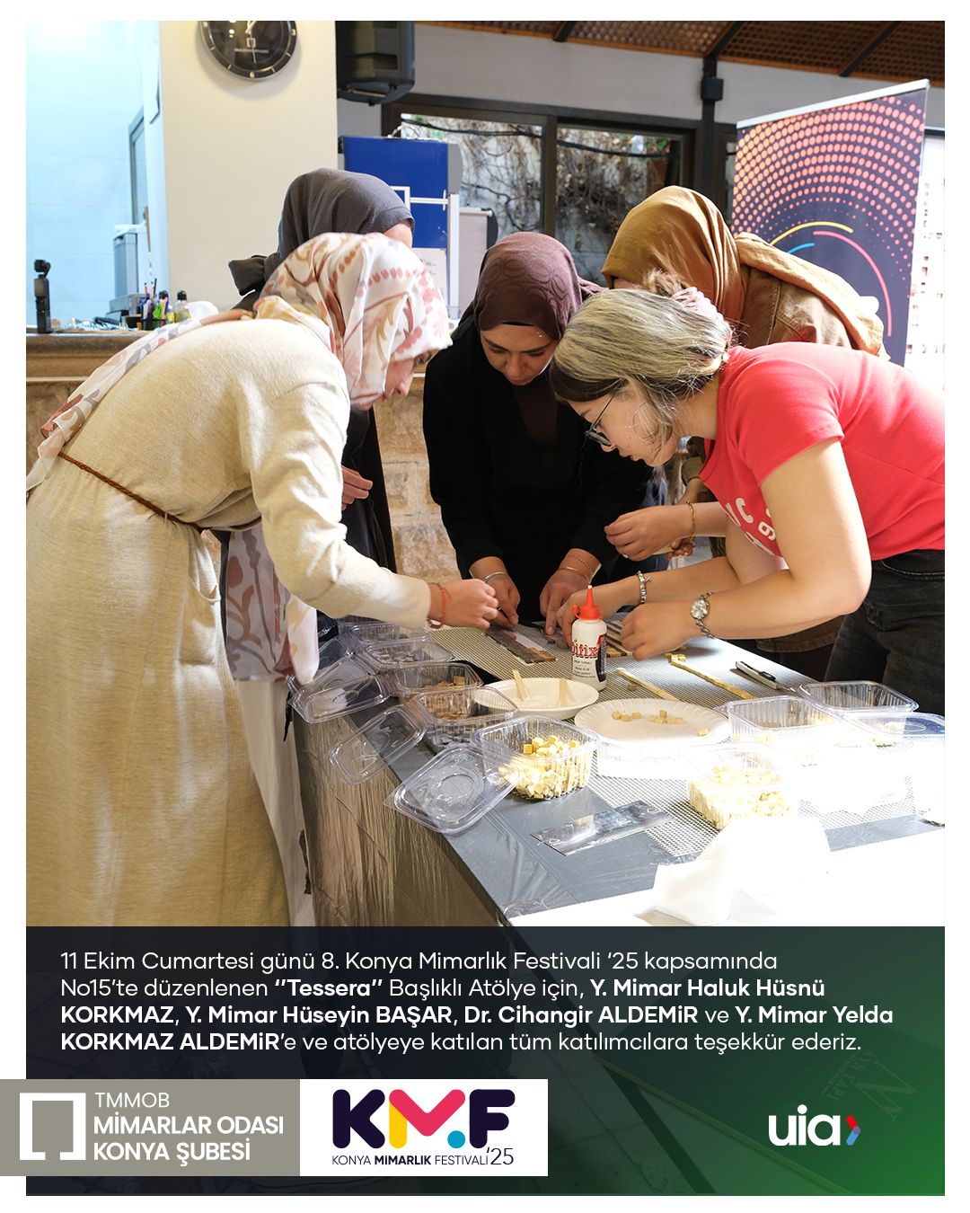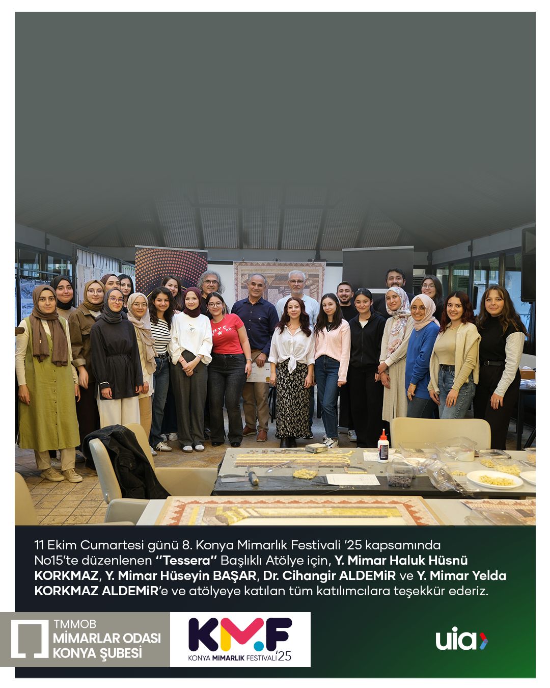 11 Ekim Cumartesi günü 8. Konya Mimarlık Festivali ‘25 kapsamında No15’te düzenlenen ‘’Tessera’’ Başlıklı Atölye için, Y. Mimar Haluk Hüsnü KORKMAZ, Y. Mimar Hüseyin BAŞAR, Dr. Cihangir ALDEMiR ve Y. Mimar Yelda KORKMAZ ALDEMiR’e ve atölyeye katılan tüm katılımcılara teşekkür ederiz.