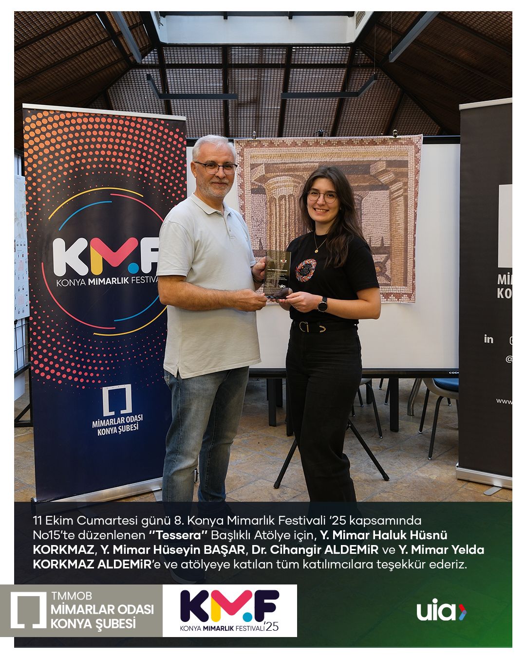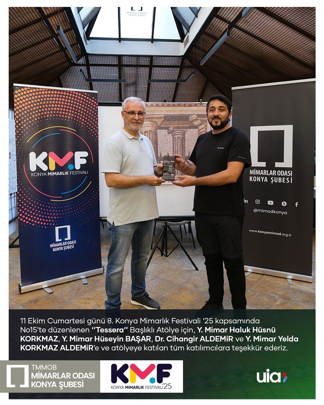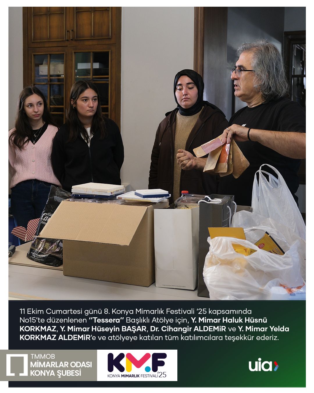11 Ekim Cumartesi günü 8. Konya Mimarlık Festivali ‘25 kapsamında No15’te düzenlenen ‘’Tessera’’ Başlıklı Atölye için, Y. Mimar Haluk Hüsnü KORKMAZ, Y. Mimar Hüseyin BAŞAR, Dr. Cihangir ALDEMiR ve Y. Mimar Yelda KORKMAZ ALDEMiR’e ve atölyeye katılan tüm katılımcılara teşekkür ederiz.
