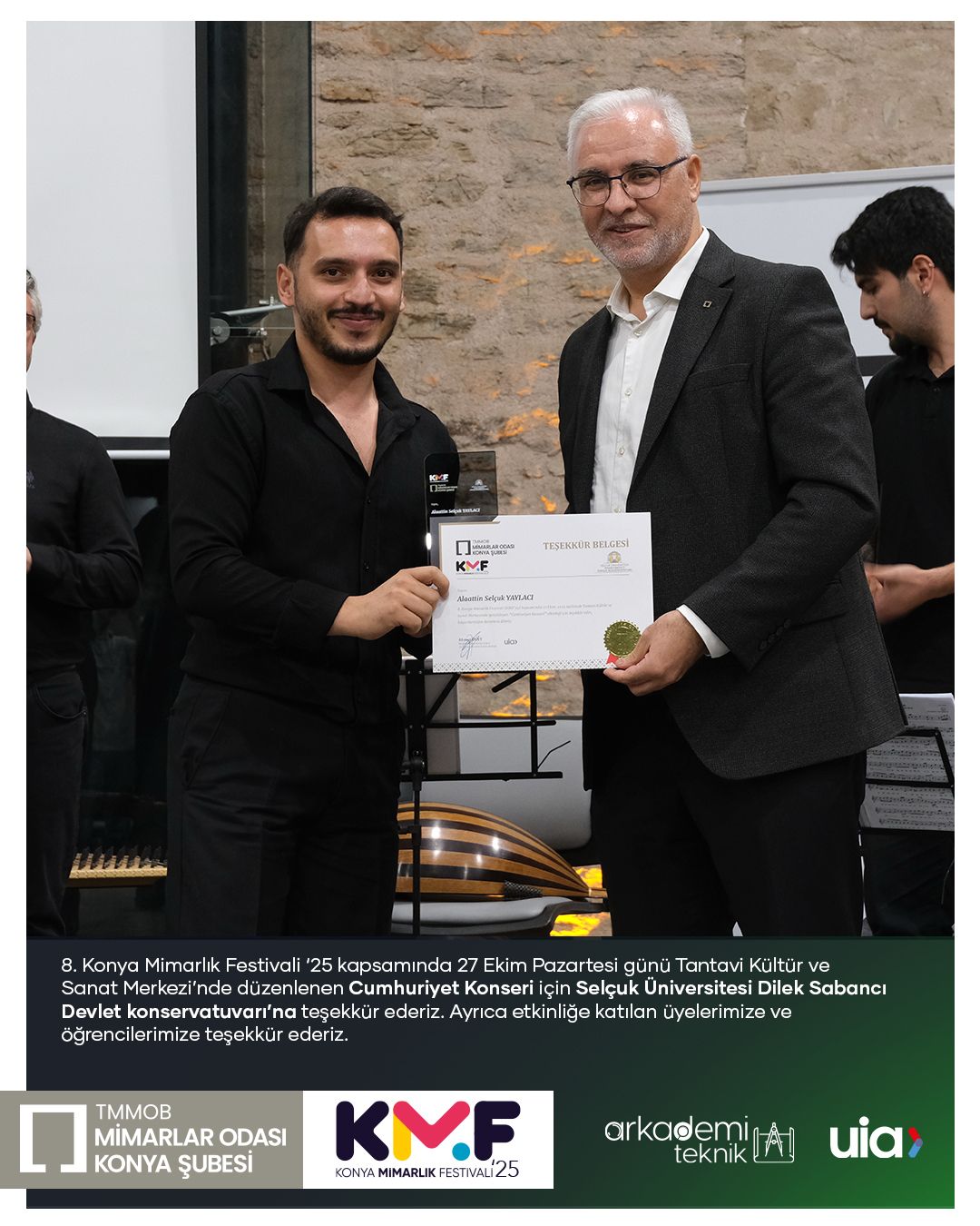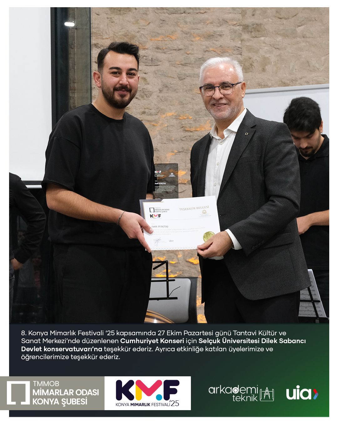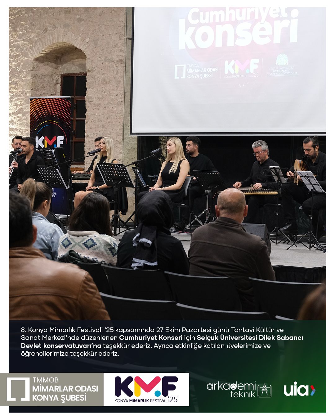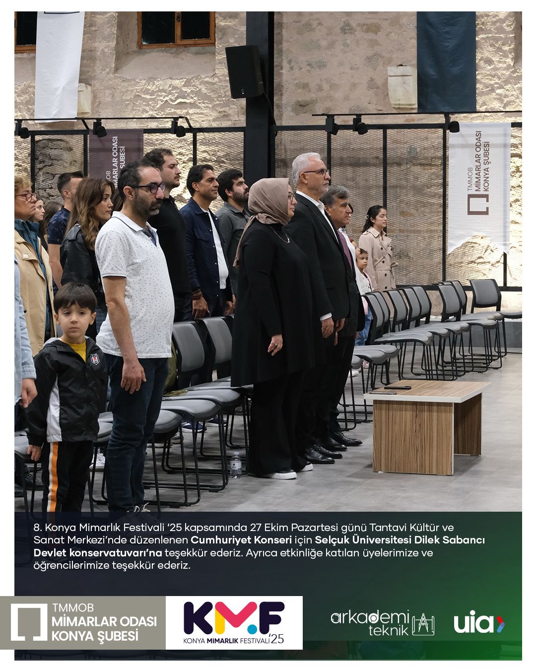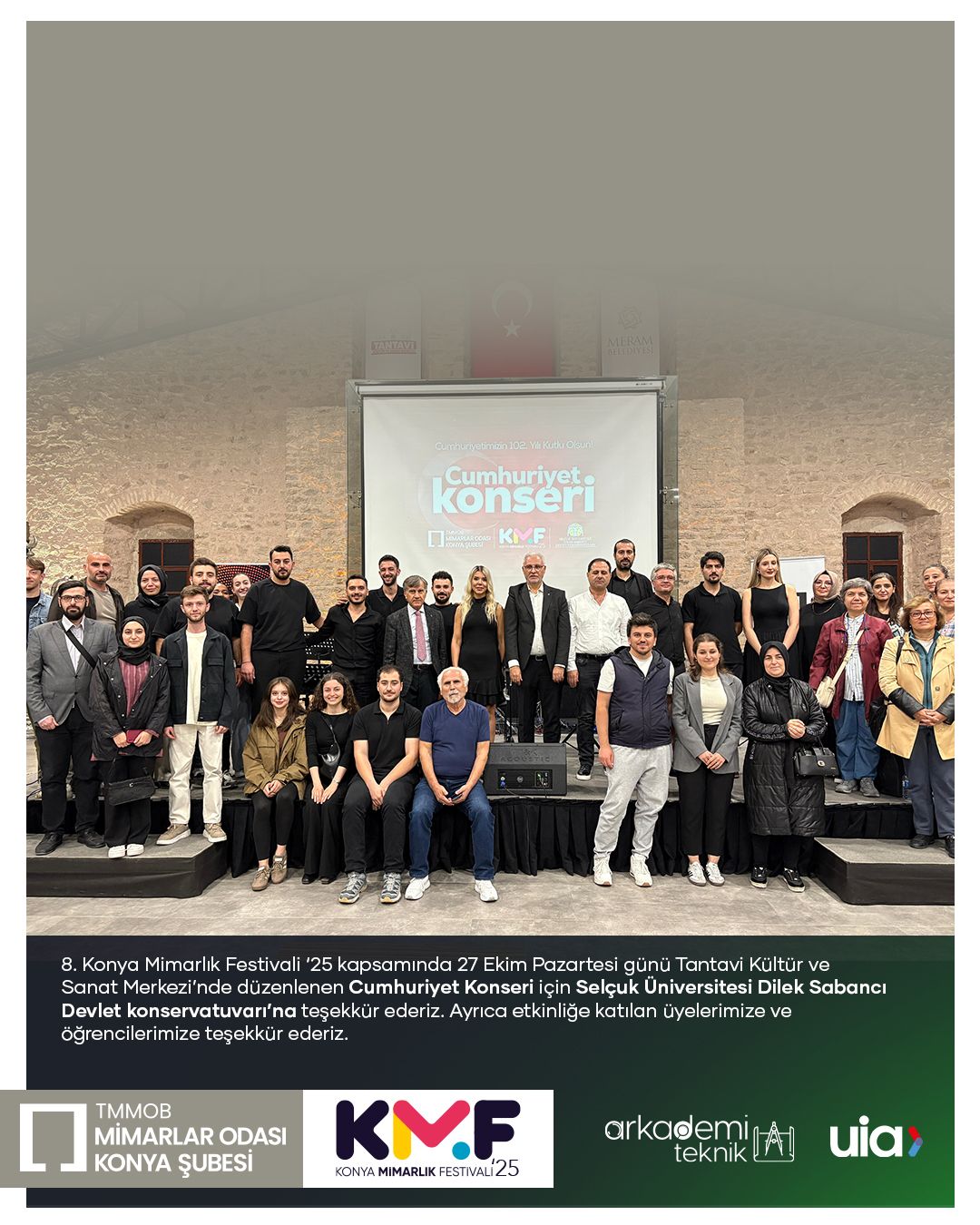 8. Konya Mimarlık Festivali ’25 kapsamında 27 Ekim Pazartesi günü Tantavi Kültür ve Sanat Merkezi’nde düzenlenen Cumhuriyet Konseri için Selçuk Üniversitesi Dilek Sabancı Devlet Konservatuvarı’na teşekkür ederiz. Ayrıca etkinliğe katılan üyelerimize ve öğrencilerimize teşekkür ederiz.