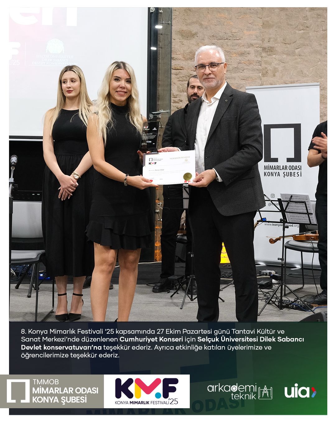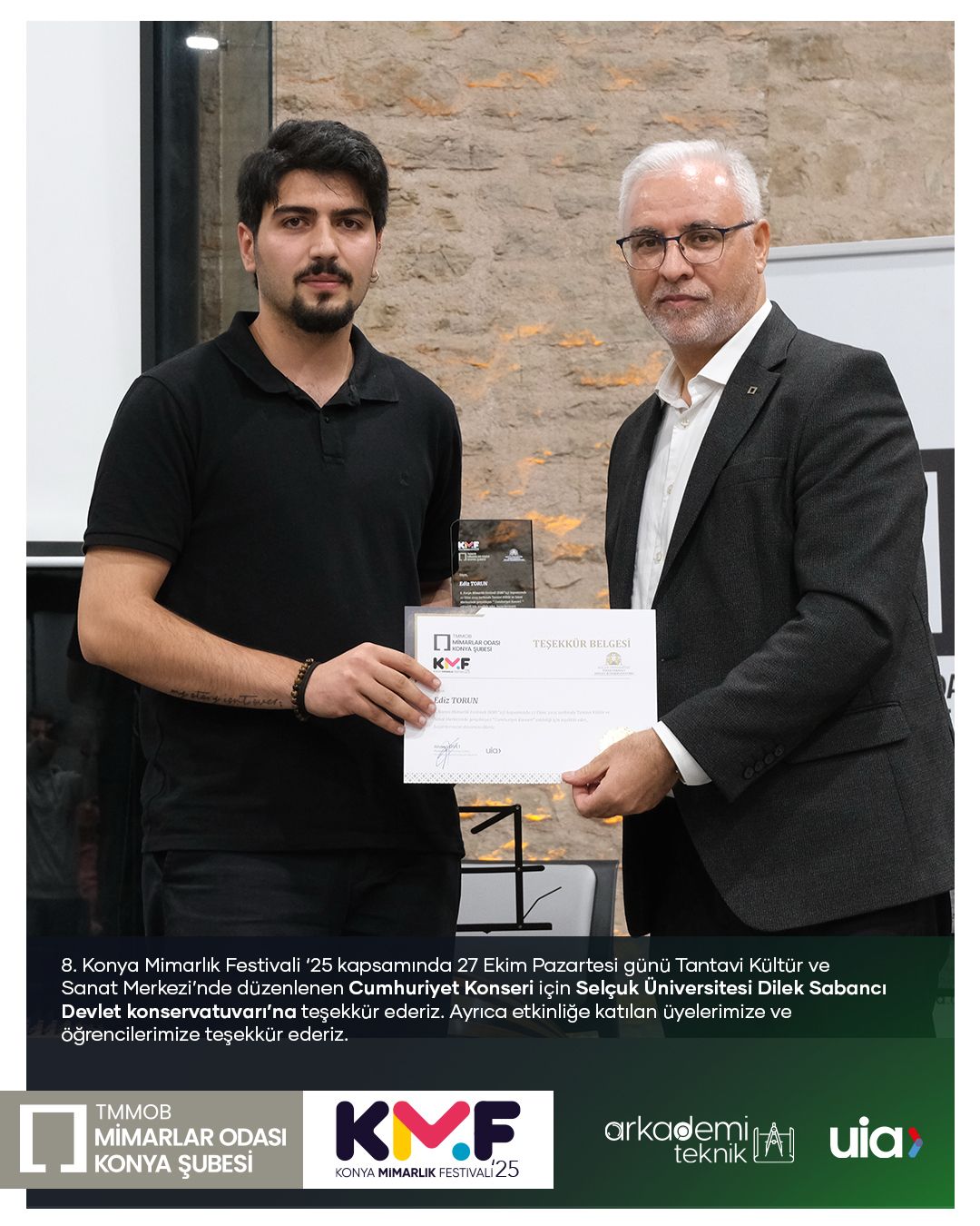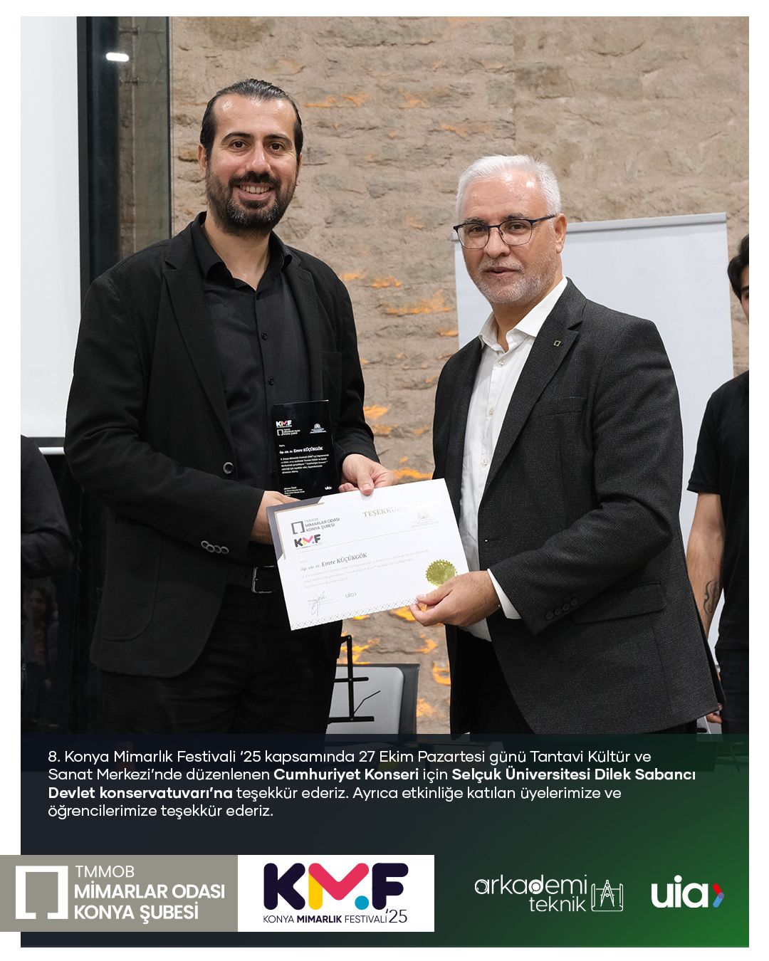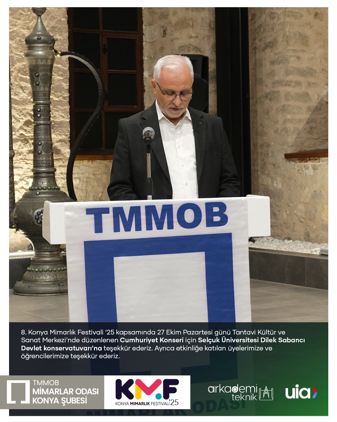 8. Konya Mimarlık Festivali ’25 kapsamında 27 Ekim Pazartesi günü Tantavi Kültür ve Sanat Merkezi’nde düzenlenen Cumhuriyet Konseri için Selçuk Üniversitesi Dilek Sabancı Devlet Konservatuvarı’na teşekkür ederiz. Ayrıca etkinliğe katılan üyelerimize ve öğrencilerimize teşekkür ederiz.
