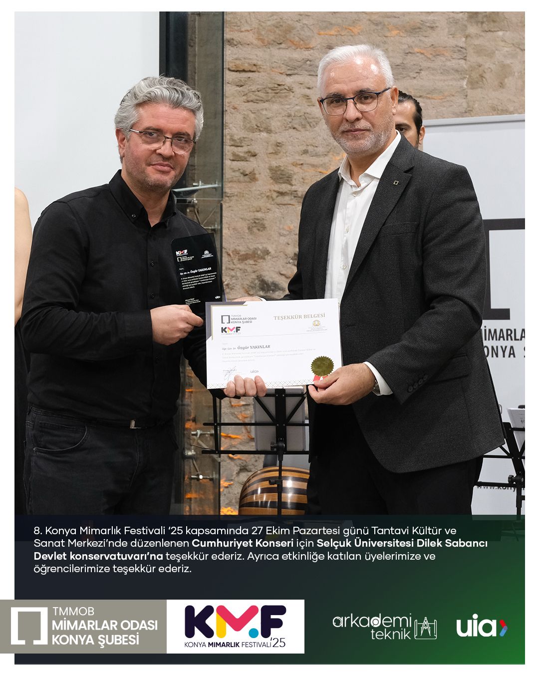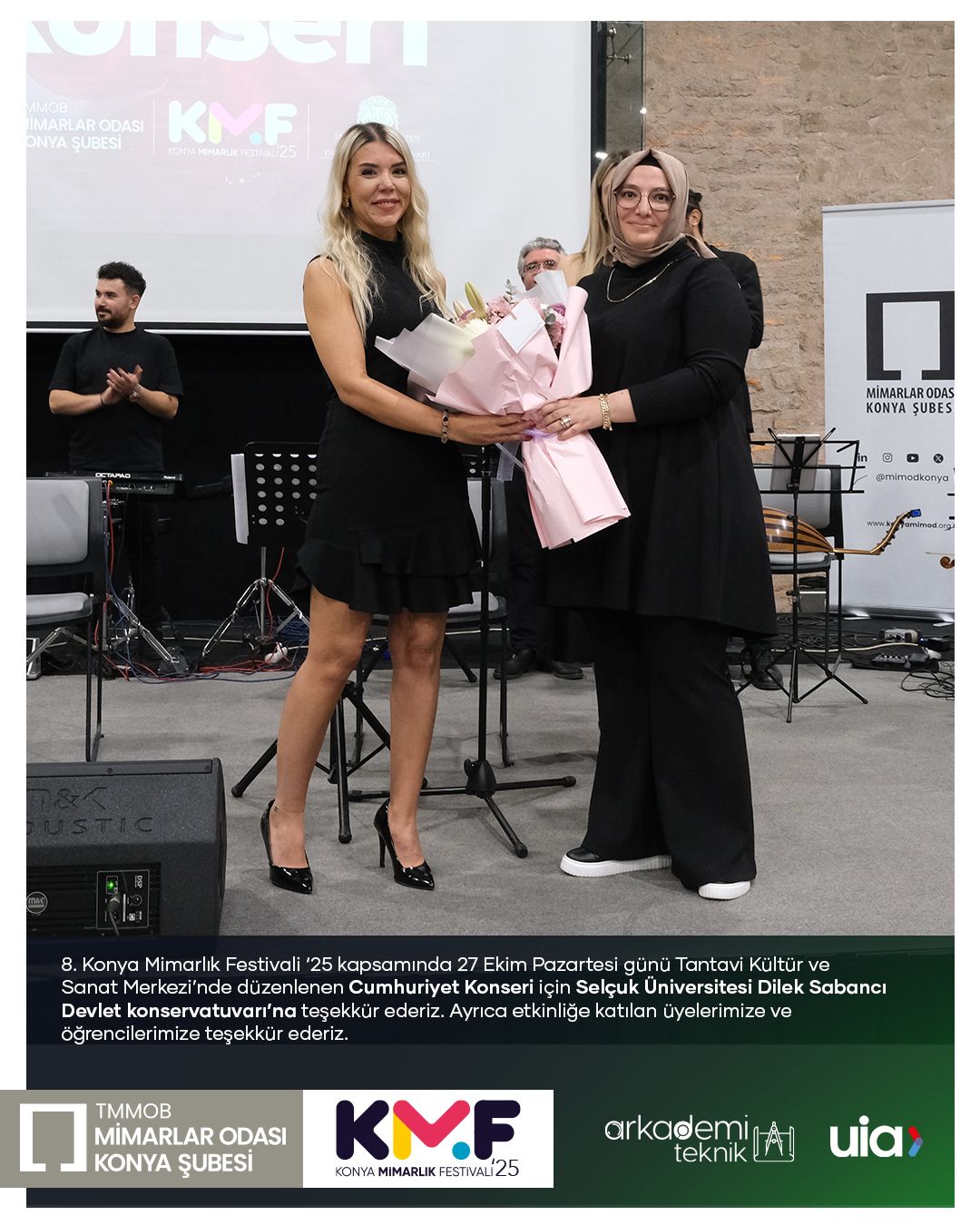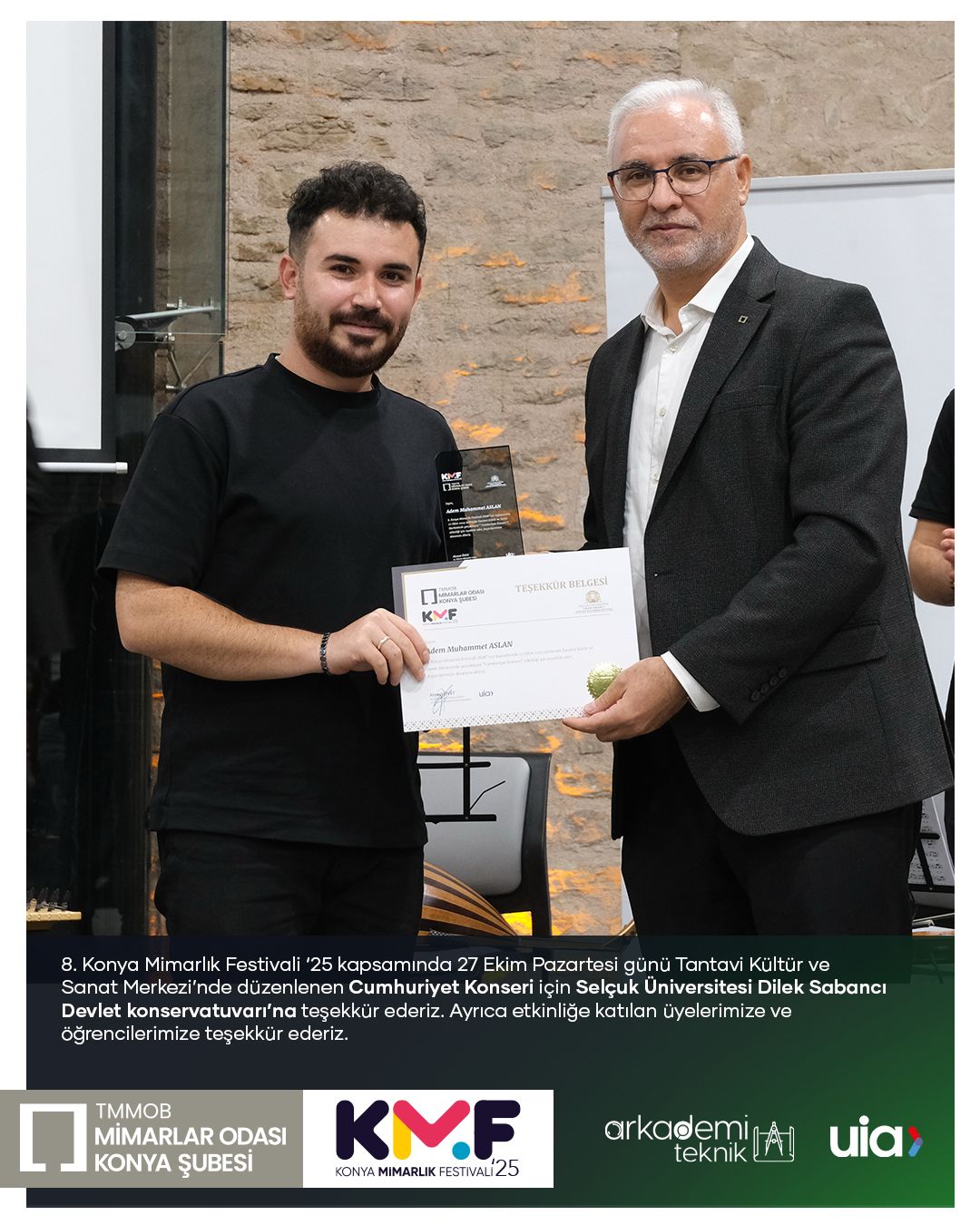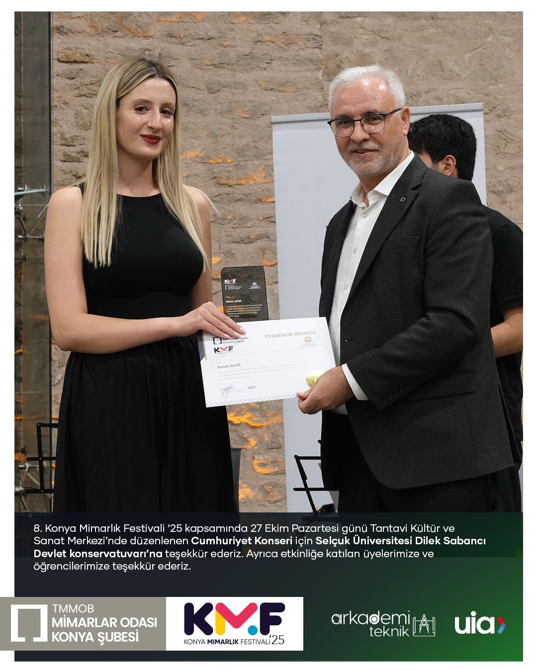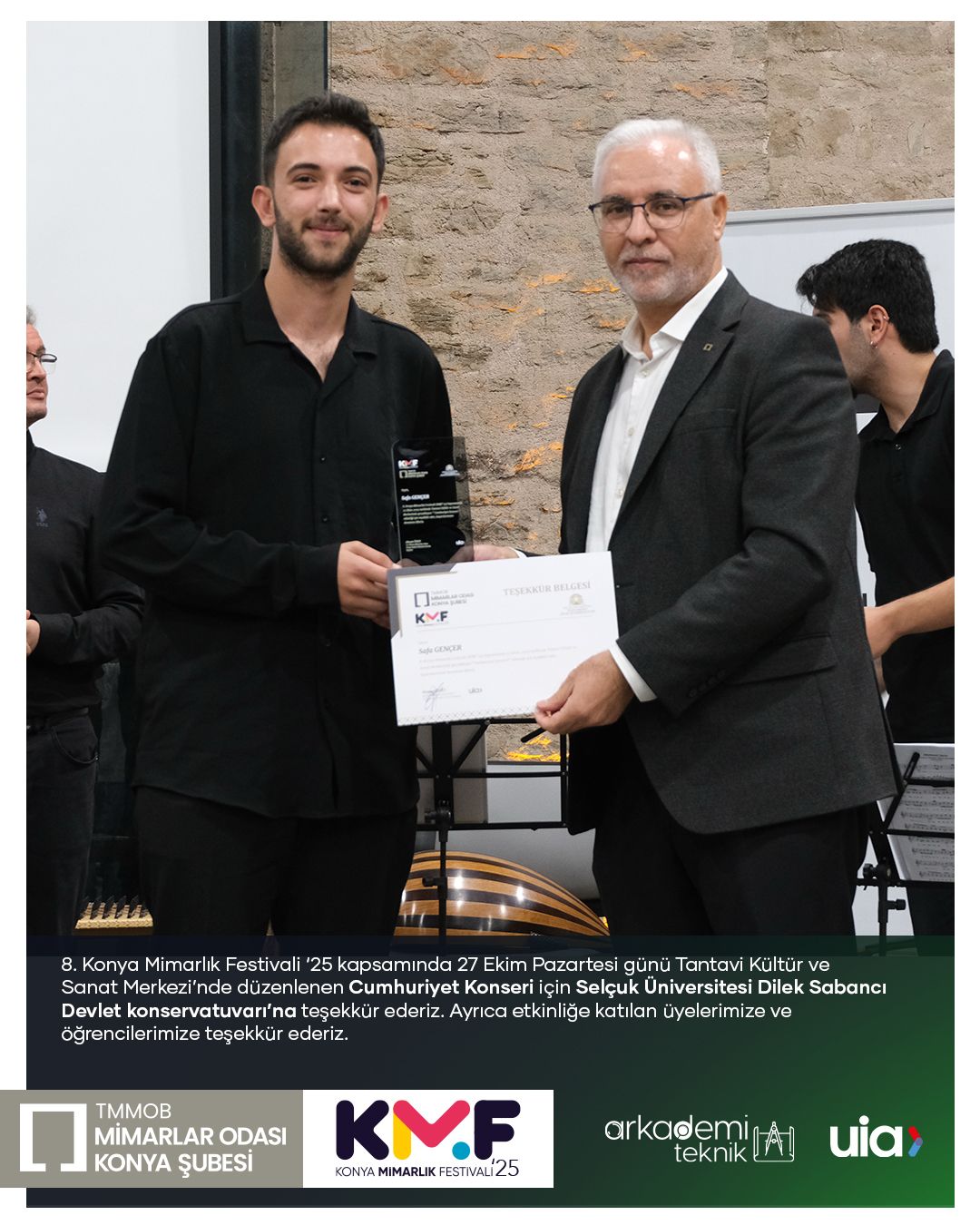 8. Konya Mimarlık Festivali ’25 kapsamında 27 Ekim Pazartesi günü Tantavi Kültür ve Sanat Merkezi’nde düzenlenen Cumhuriyet Konseri için Selçuk Üniversitesi Dilek Sabancı Devlet Konservatuvarı’na teşekkür ederiz. Ayrıca etkinliğe katılan üyelerimize ve öğrencilerimize teşekkür ederiz.