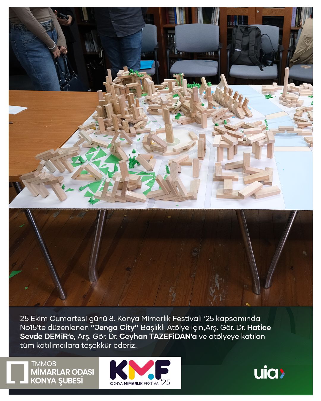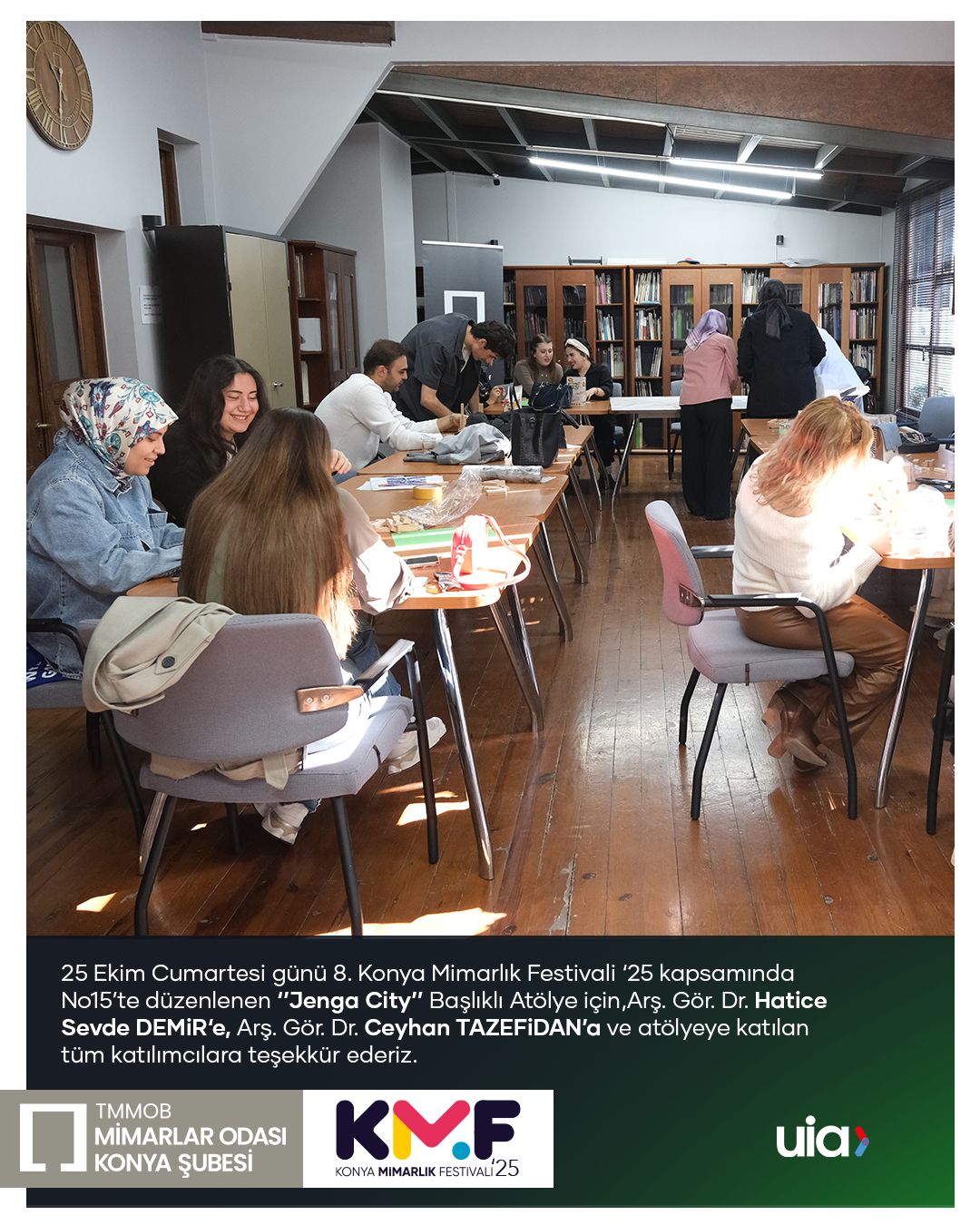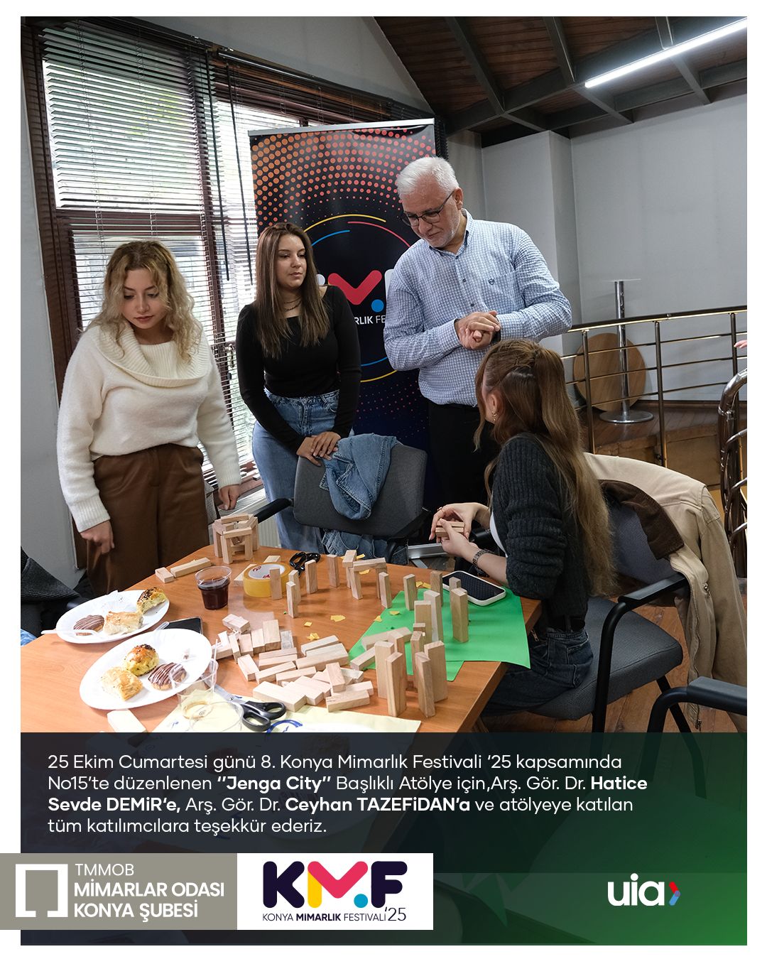 25 Ekim Cumartesi günü 8. Konya Mimarlık Festivali ‘25 kapsamında No15’te düzenlenen ‘’Jenga City’’ Başlıklı Atölye için, Arş. Gör. Dr. Hatice Sevde DEMiR‘e, Arş. Gör. Dr. Ceyhan TAZEFiDAN’a ve atölyeye katılan tüm katılımcılara teşekkür ederiz.