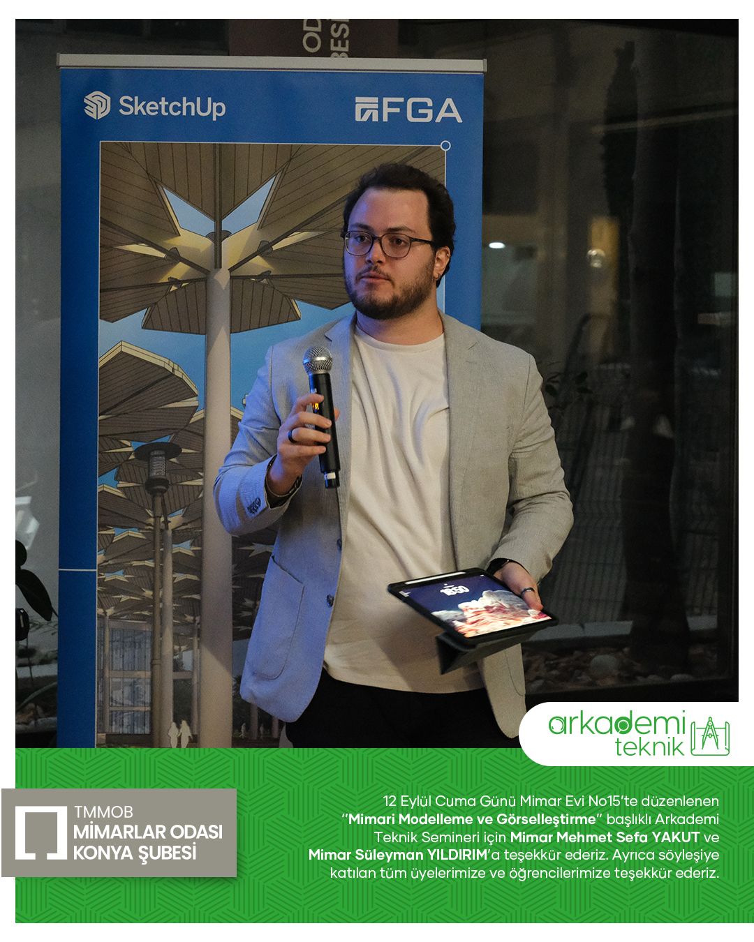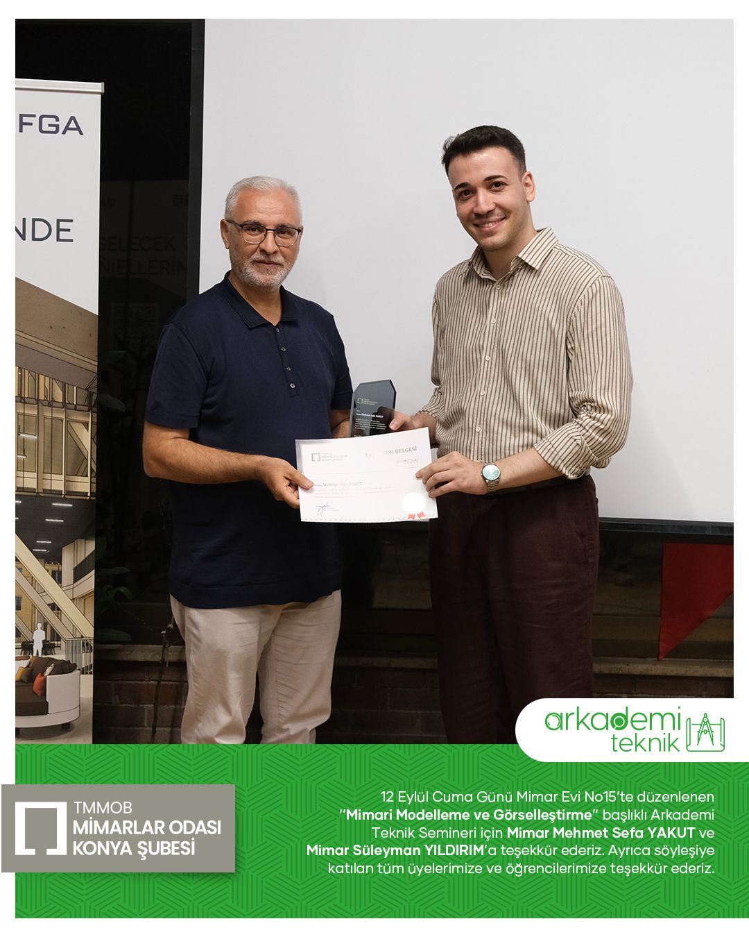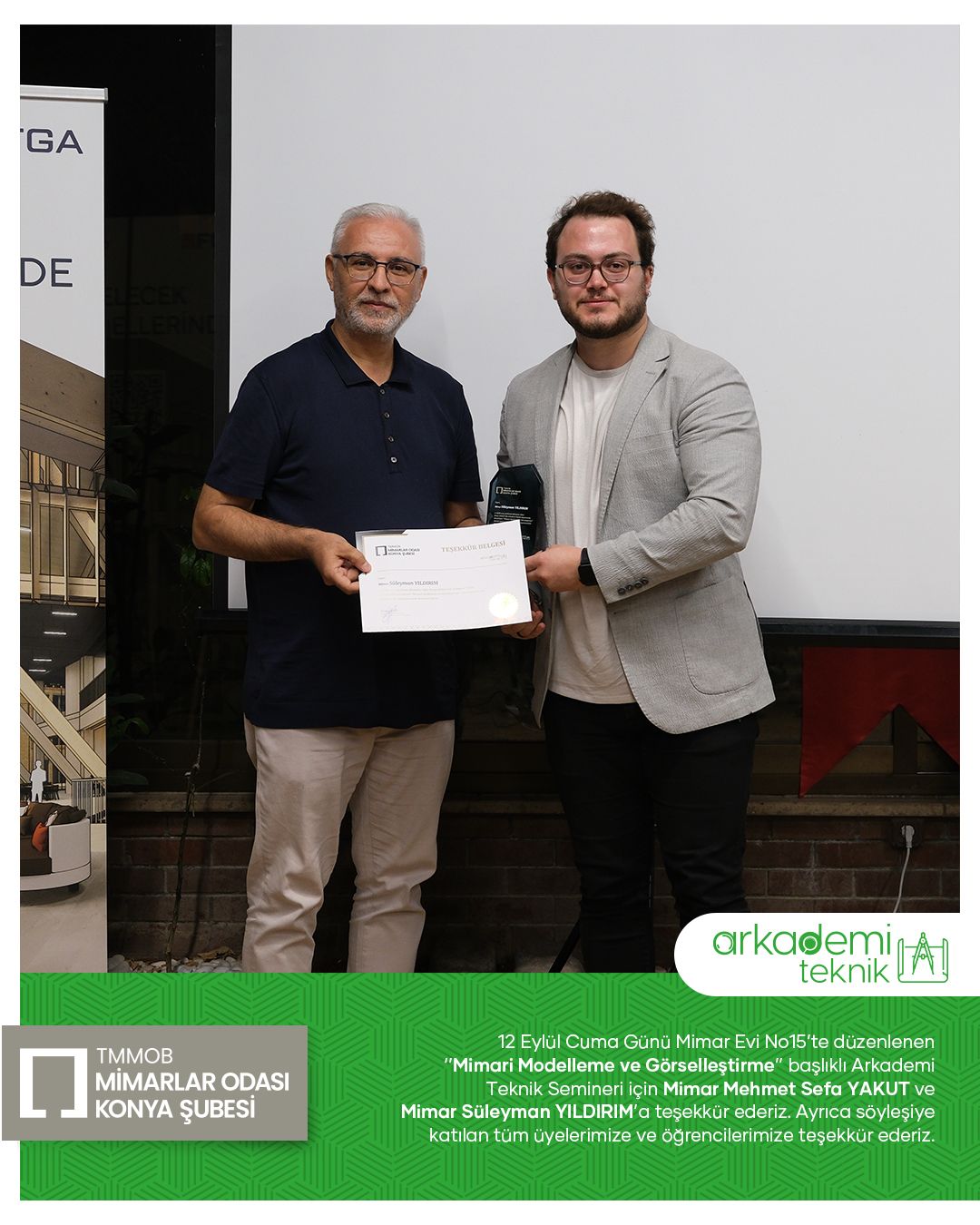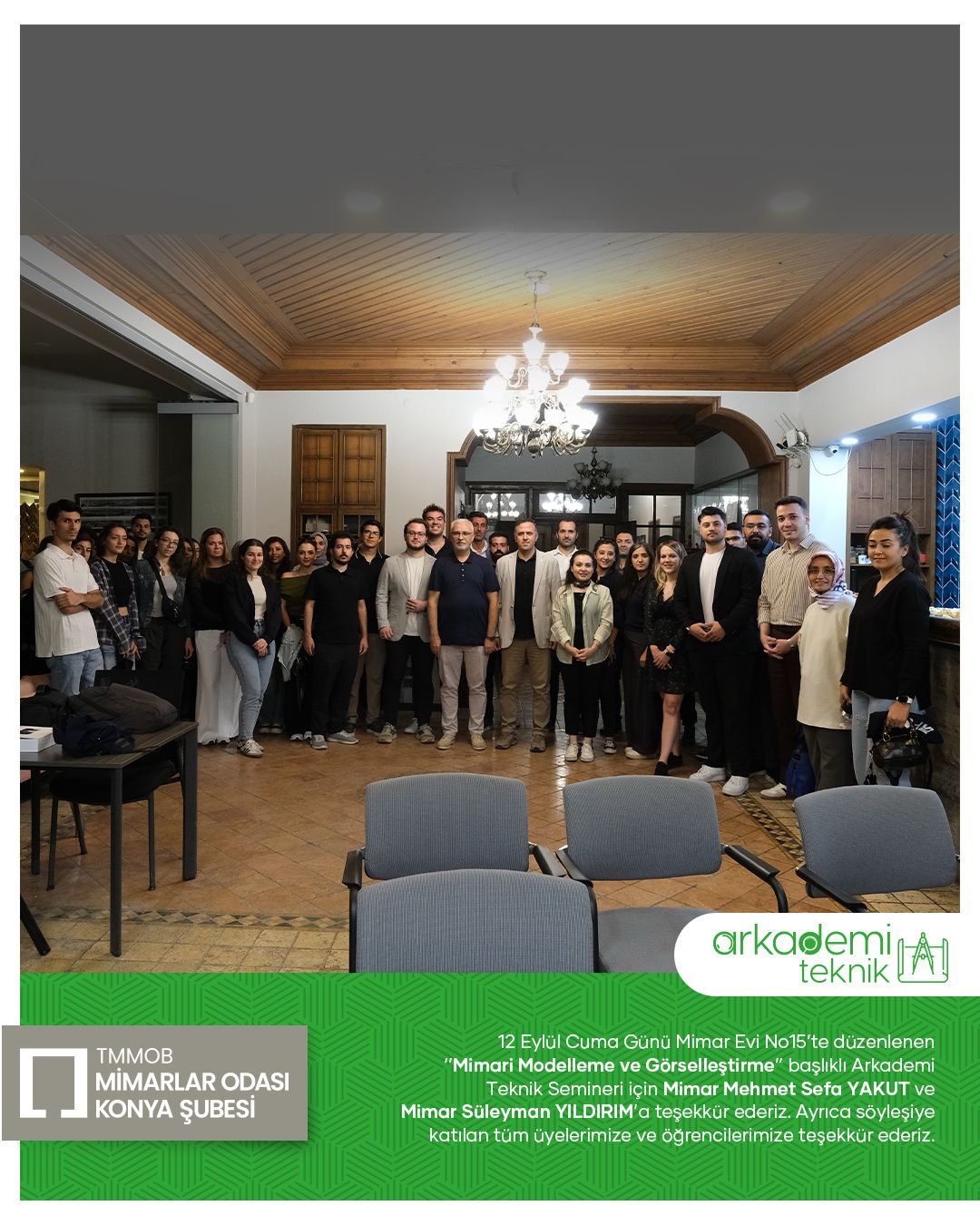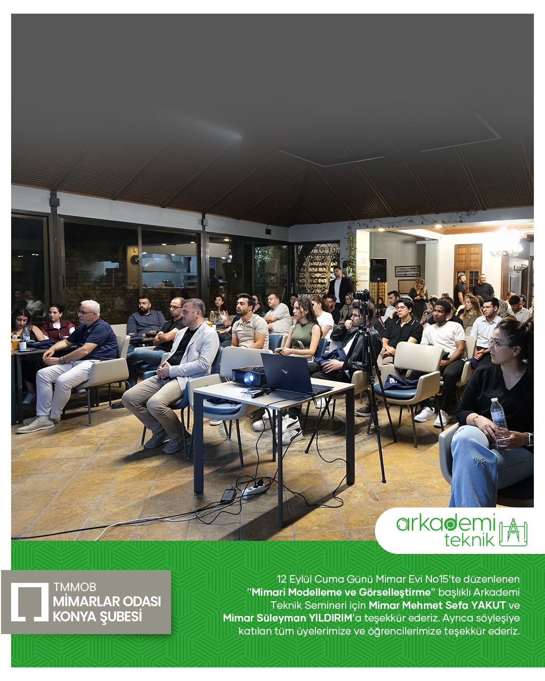12 Eylül Cuma No15 Mimar Evi'nde FGA Mimarlık bünyesinde düzenlenen “Mimari Modelleme ve Görselleştirme” başlıklı Arkademi Teknik Semineri için Mimar Sefa YAKUT ve Mimar Süleyman YILDIRIM’a ve seminere katılan tüm üye ve öğrencilerimize teşekkür ederiz.