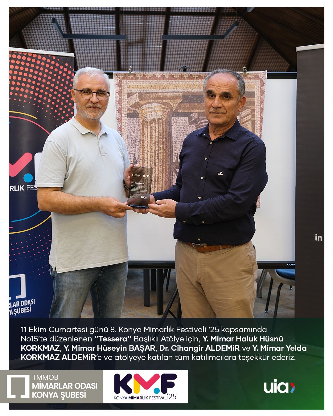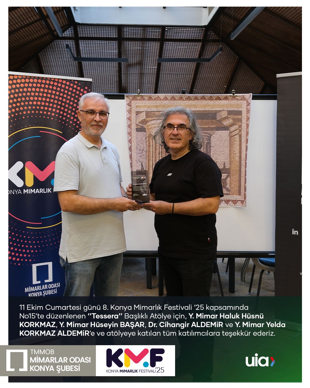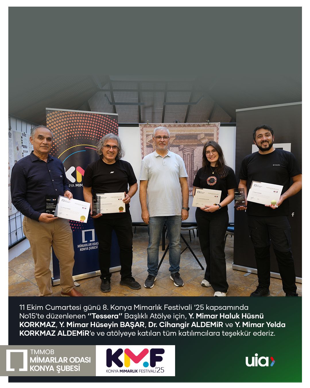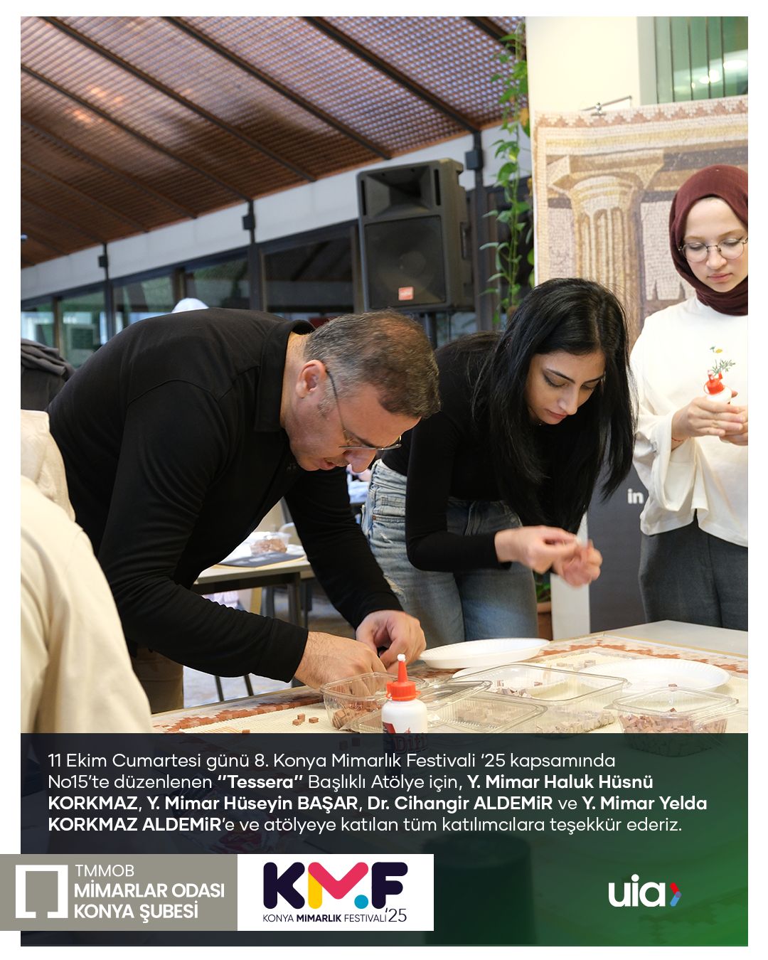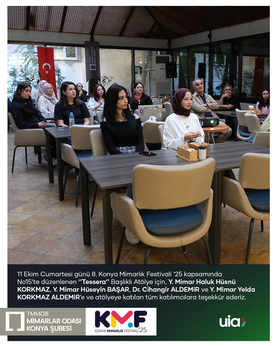 11 Ekim Cumartesi günü 8. Konya Mimarlık Festivali ‘25 kapsamında No15’te düzenlenen ‘’Tessera’’ Başlıklı Atölye için, Y. Mimar Haluk Hüsnü KORKMAZ, Y. Mimar Hüseyin BAŞAR, Dr. Cihangir ALDEMiR ve Y. Mimar Yelda KORKMAZ ALDEMiR’e ve atölyeye katılan tüm katılımcılara teşekkür ederiz.