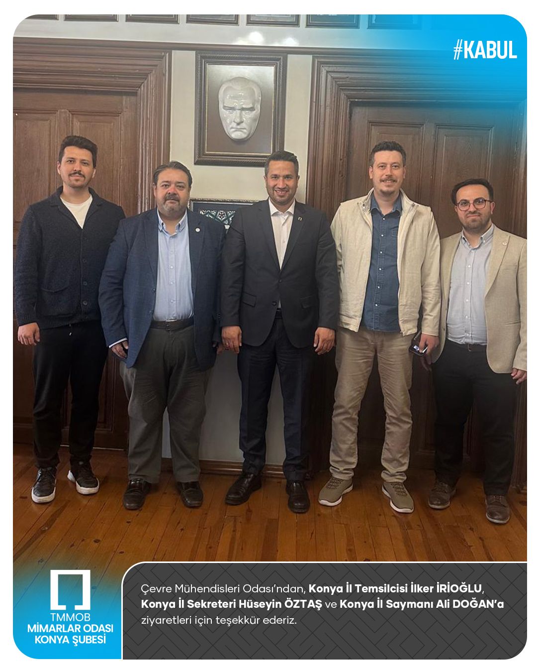 Çevre Mühendisleri Odası’ndan, Konya İl Temsilcisi İlker İRİOĞLU, Konya İl Sekreteri Hüseyin ÖZTAŞ ve Konya İl Saymanı Ali DOĞAN’a ziyaretleri için teşekkür ederiz.