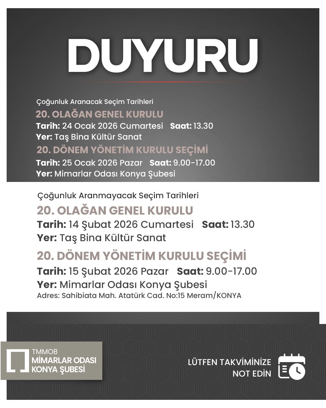 MİMARLAR ODASI KONYA ŞUBESİ 20. DÖNEM GENEL KURUL VE SEÇİM DUYURUSU