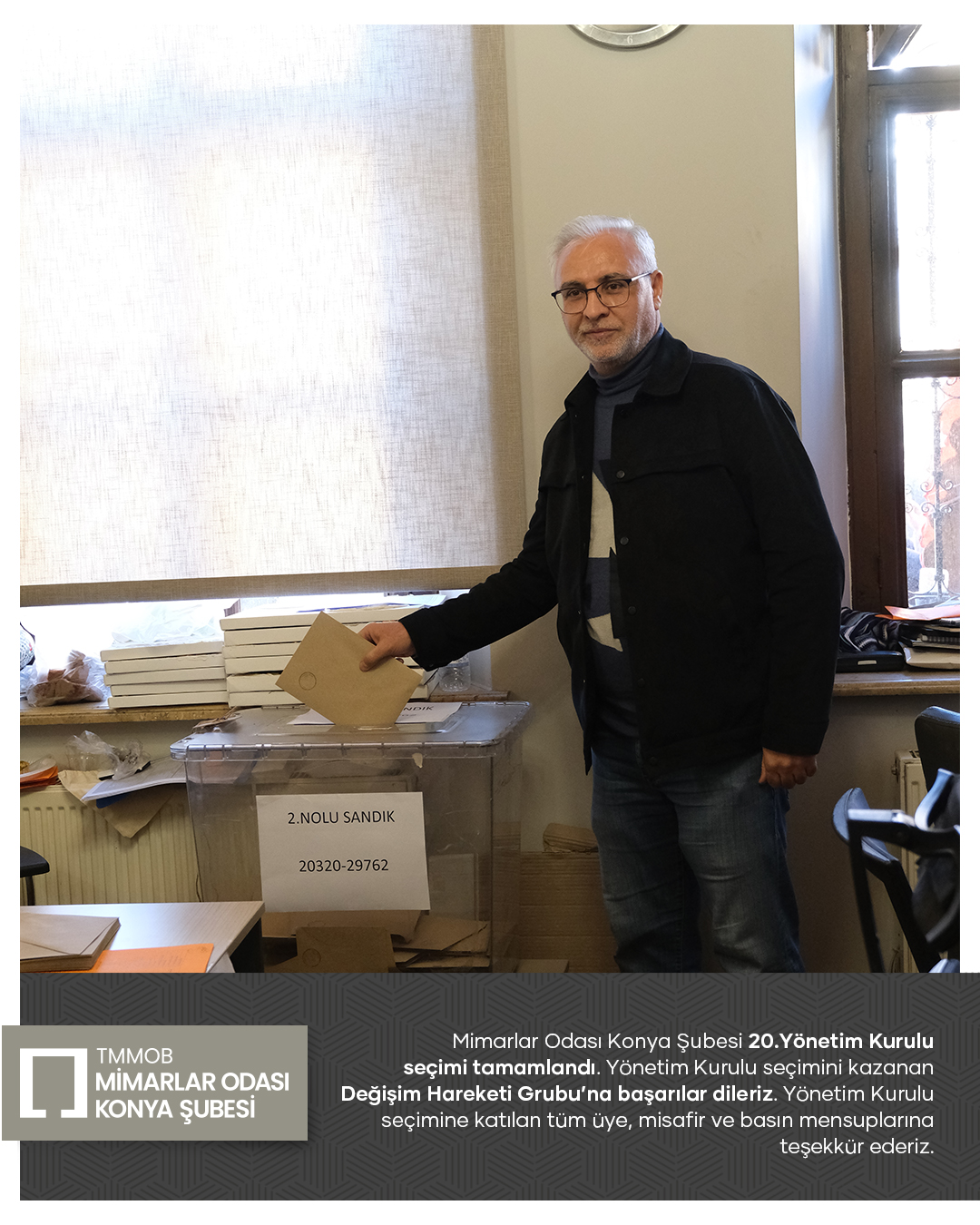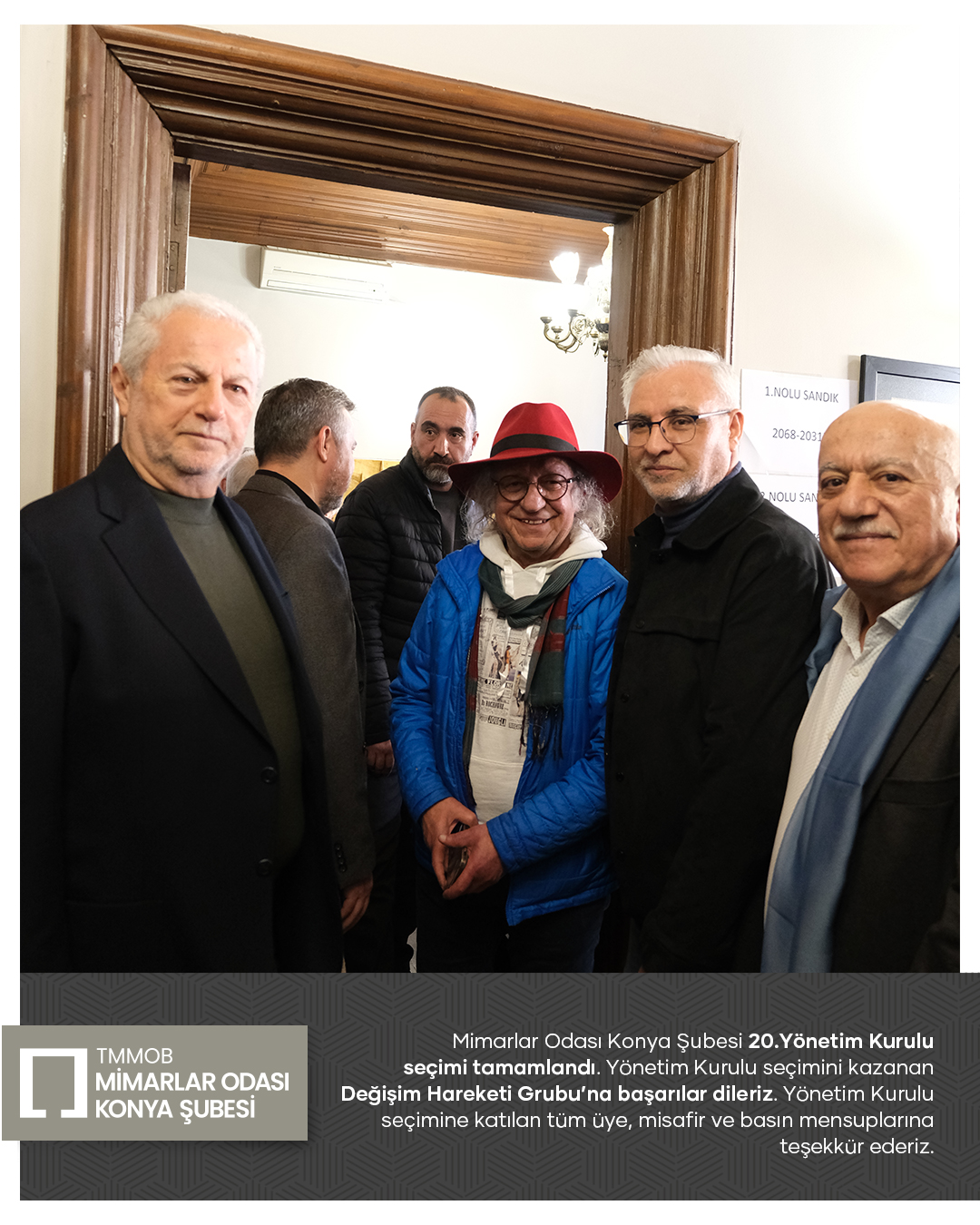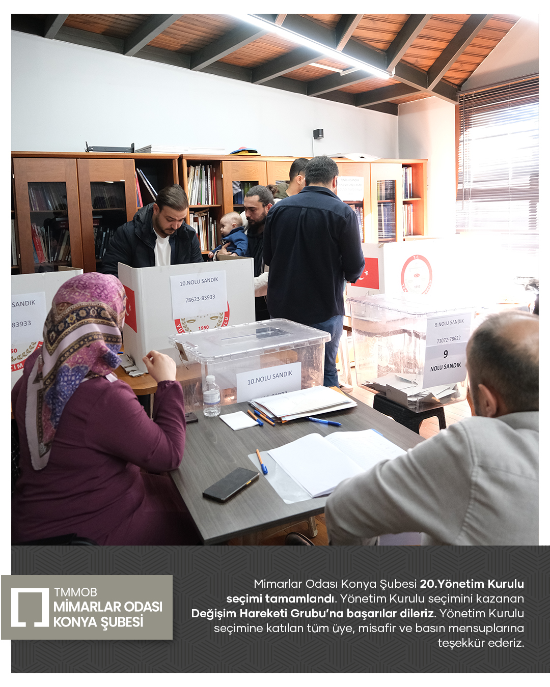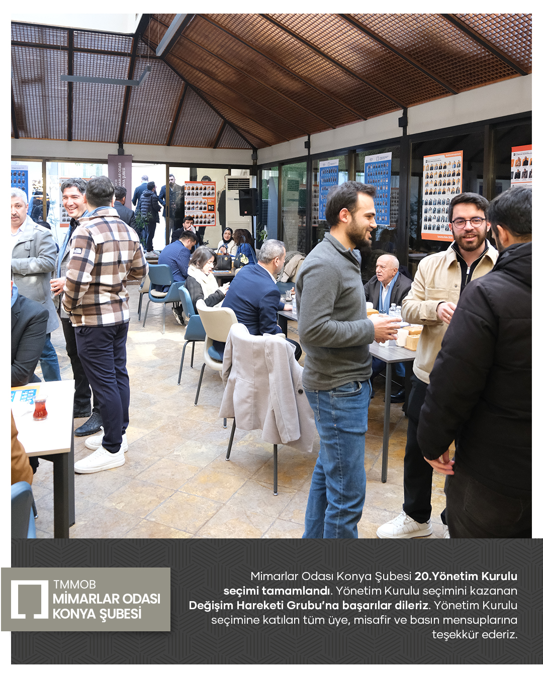 Mimarlar Odası Konya Şubesi 20. Dönem Yönetim Kurulu seçim süreci tamamlandı. Seçim sonucuna göre Yönetim Kurulu üyeliklerinin tamamını kazanan Değişim Hareketi Grubu’nu tebrik ediyor; yeni dönemde meslek ortamına, odamıza ve kentimize yönelik yürütecekleri çalışmalarda üstün başarılar diliyoruz.