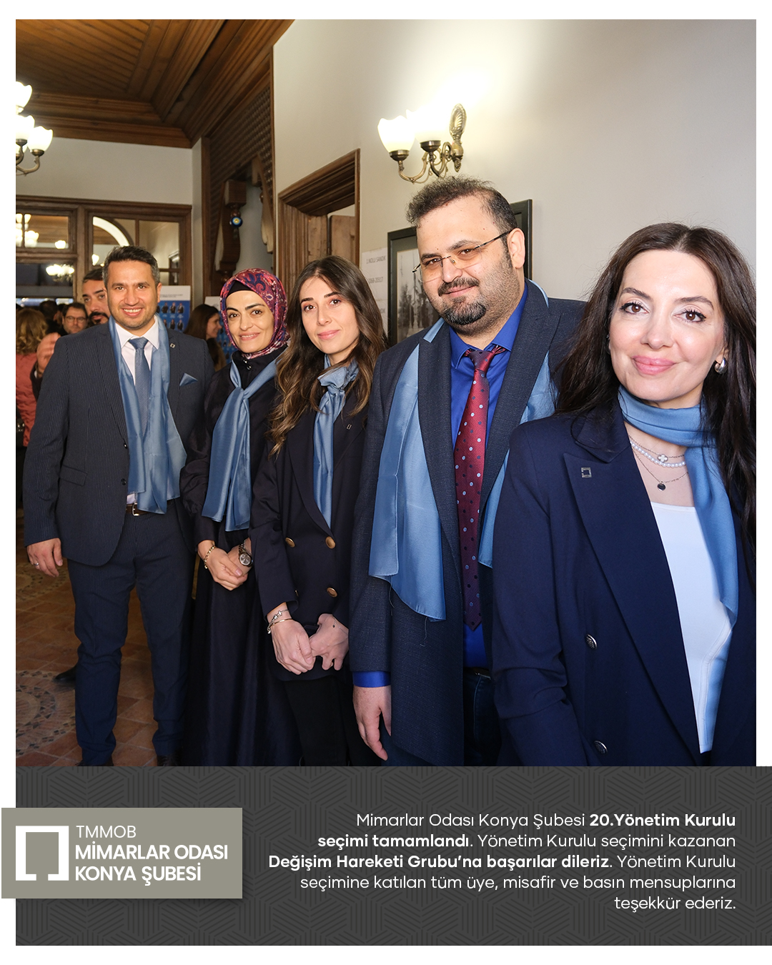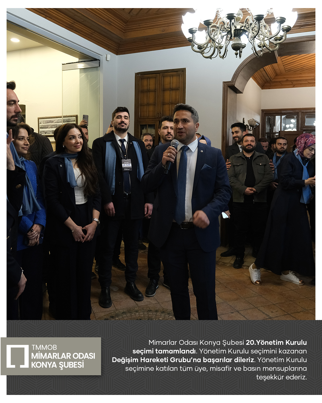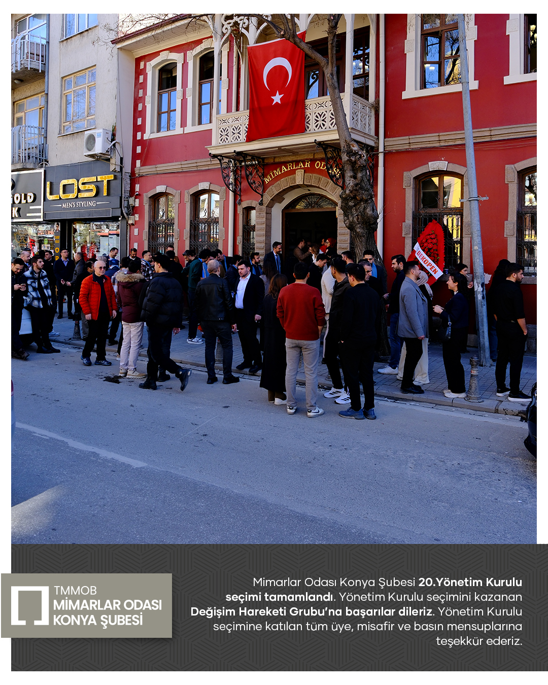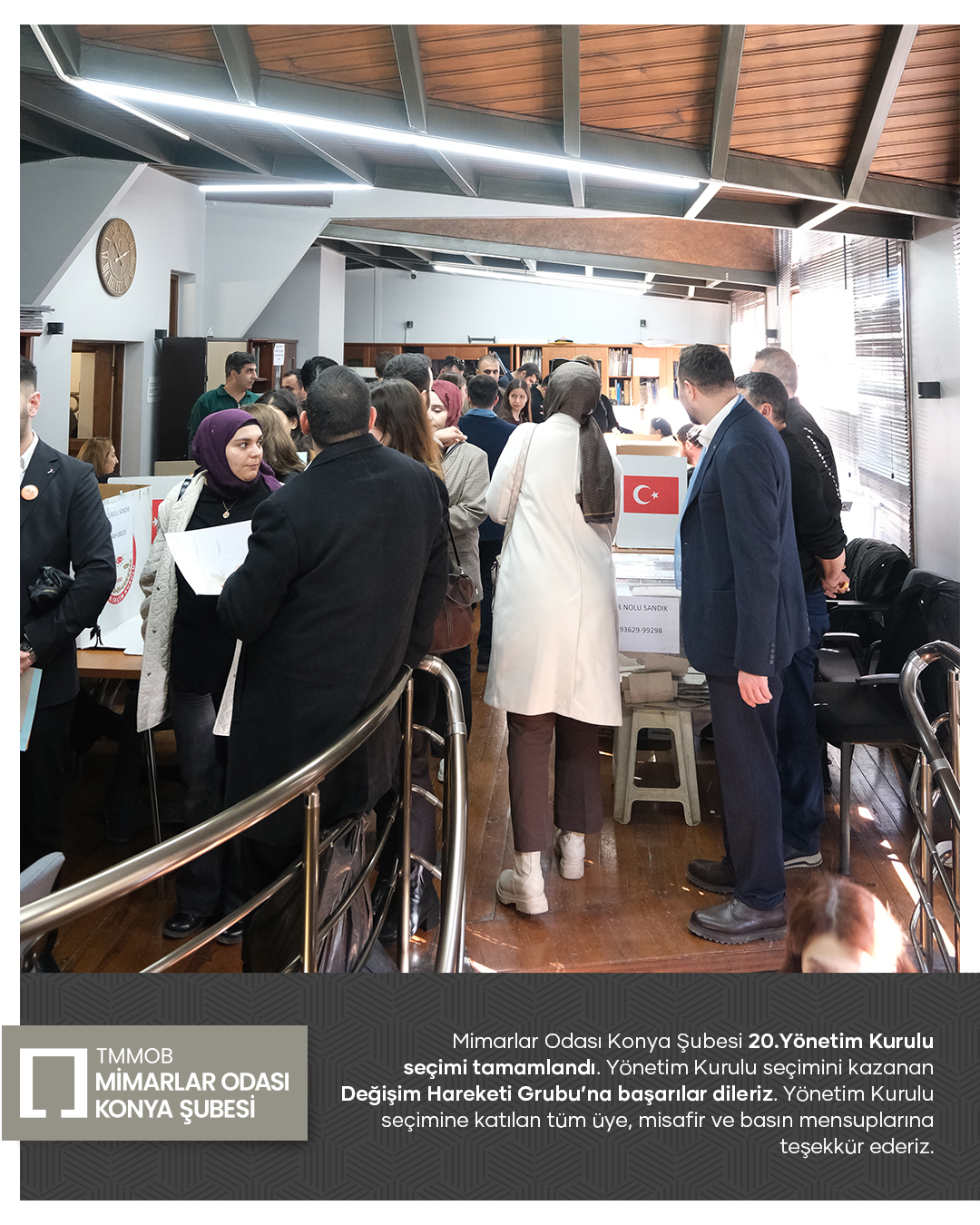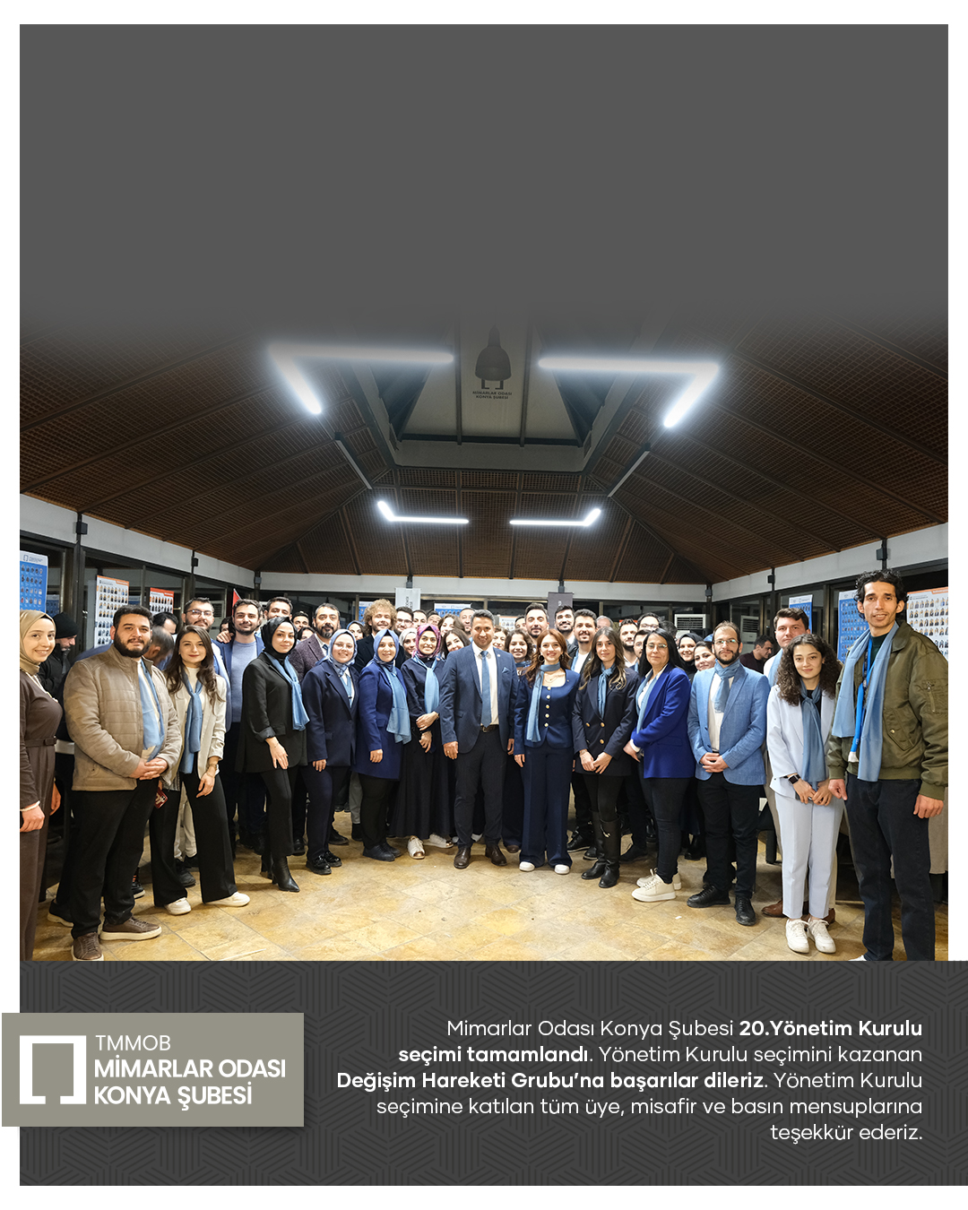 Mimarlar Odası Konya Şubesi 20. Dönem Yönetim Kurulu seçim süreci tamamlandı. Seçim sonucuna göre Yönetim Kurulu üyeliklerinin tamamını kazanan Değişim Hareketi Grubu’nu tebrik ediyor; yeni dönemde meslek ortamına, odamıza ve kentimize yönelik yürütecekleri çalışmalarda üstün başarılar diliyoruz.