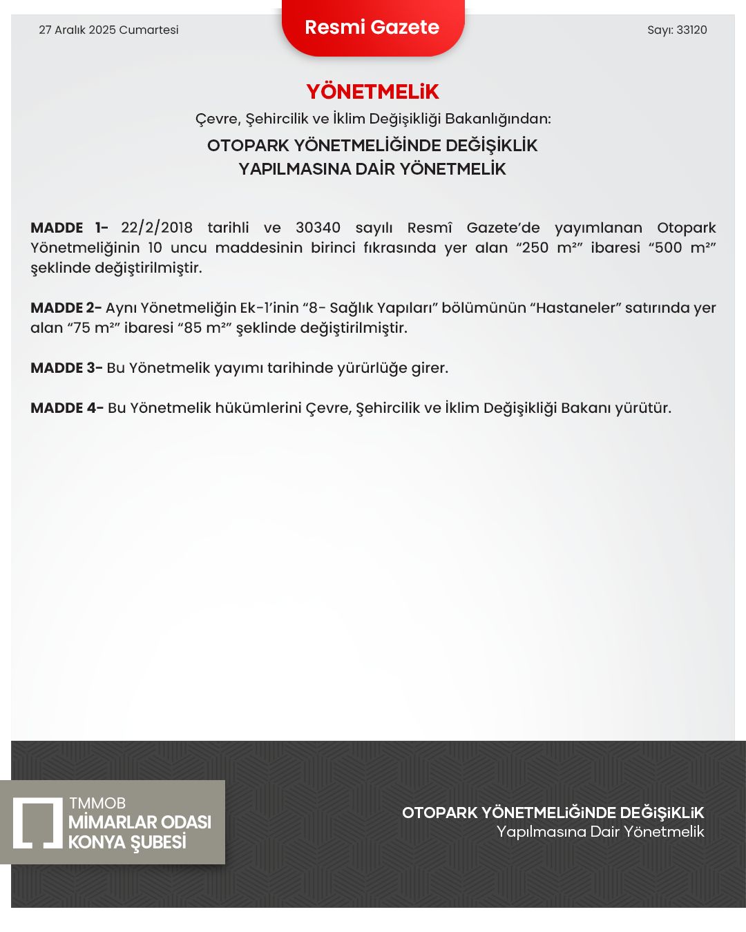 Otopark Yönetmeliğinde Değişiklik Yapılmasına Dair Yönetmelik